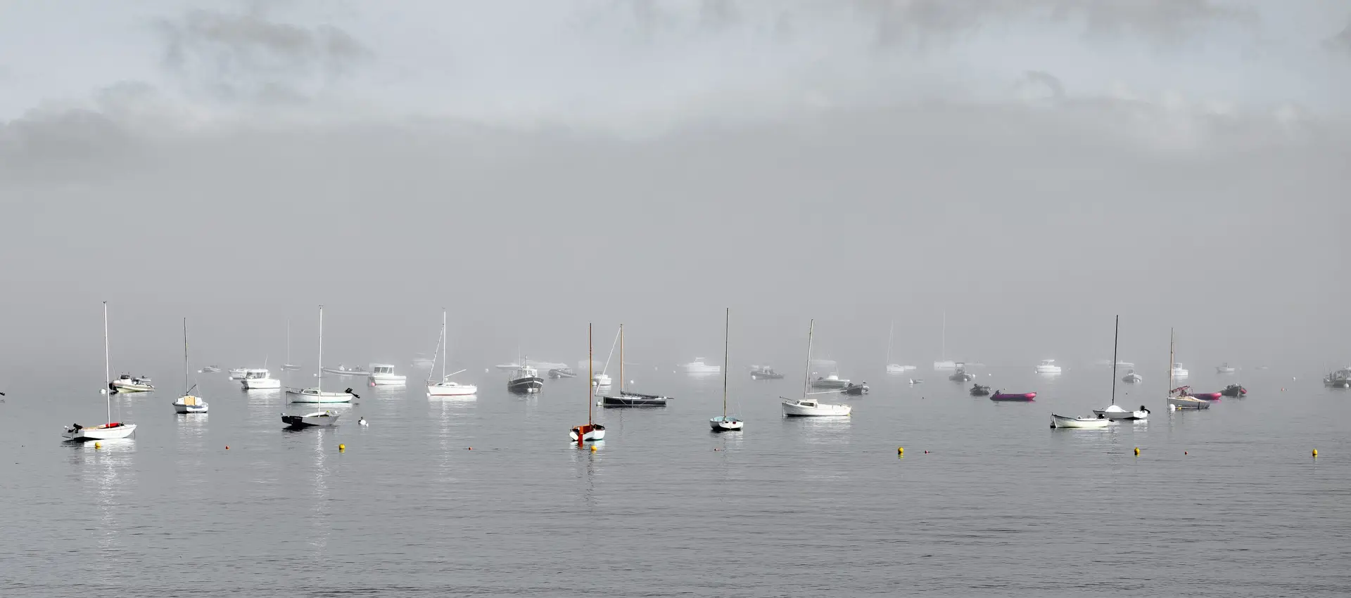 Premières heures de la journée sur la plage du Kelenn à Carantec (Bretagne) un matin de la fin du mois d’aout 2021. L’air encore un peu frais de cette matinée de fin d’été a piégé la petite brume qui s’est élevée au-dessus de la Mer. La petite brise de terre ne s’est pas encore installée pour balayer ces traces du matin et dégager les embarcations amarrées à leur bouées.